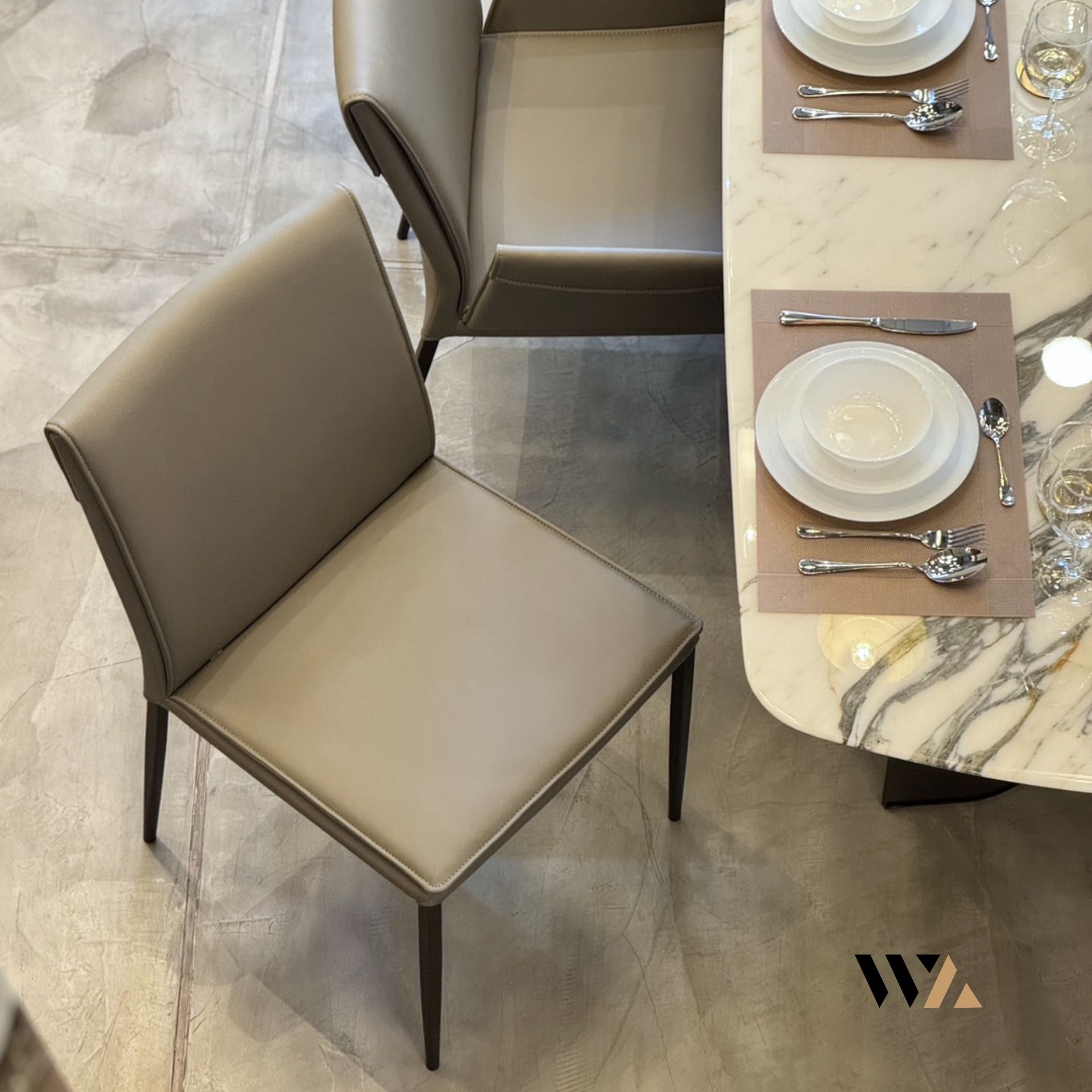 เพื่อให้ภาพรวมของห้องอาหารดู Luxury อย่างสมบูรณ์แบบ การให้ความสำคัญกับ dining table เพียงอย่างเดียวอาจไม่เพียงพอ แต่ต้องคำนึงถึงความต่อเนื่องและการสอดประสานกันของเก้าอี้และวัสดุตกแต่งอื่นๆ ในชุด dining table set ด้วย การเลือกวัสดุบุเก้าอี้จึงเป็นอีกหนึ่งขั้นตอนที่ต้องพิถีพิถัน แนะนำให้เลือกใช้ผ้าบุจากแบรนด์ชั้นนำระดับโลกที่ให้สัมผัสเลิศหรู เช่น ผ้ากำมะหยี่ (Velvet) เกรดพรีเมียมที่มีความหนานุ่มและเล่นแสงเงา ซึ่งจะช่วยเพิ่มความรู้สึกอบอุ่นและหรูหราให้กับห้อง หรือหากต้องการความคลาสสิกที่ยิ่งใช้งานยิ่งสวยงาม หนังแท้แบบ Full Grain หรือหนัง Nappa คือตัวเลือกที่ไม่เคยทำให้ผิดหวัง เพราะนอกจากจะให้สัมผัสที่นุ่มสบายผิวแล้ว ยังสะท้อนถึงรสนิยมที่เหนือระดับของเจ้าของบ้าน การจับคู่สีของเก้าอี้ให้ล้อไปกับลวดลายของหินบนหน้าท็อป หรือการเลือกสีที่ตัดกันอย่างมีชั้นเชิง จะช่วยให้ชุดโต๊ะอาหารของคุณดูมีชีวิตชีวาและน่าค้นหามากยิ่งขึ้น การใส่ใจในทุกจุดสัมผัสเหล่านี้คือสิ่งที่แยกความแตกต่างระหว่างเฟอร์นิเจอร์ทั่วไปกับเฟอร์นิเจอร์ระดับลักชัวรีอย่างแท้จริง