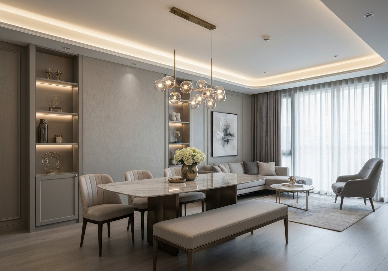 แสงสว่างเป็นตัวกำหนดอารมณ์ของพื้นที่ในแต่ละช่วงเวลา การเลือกโคมไฟที่สามารถปรับเปลี่ยนความเข้มและโทนสีของแสงได้เป็นสิ่งจำเป็นอย่างยิ่ง ในช่วงกลางวันที่ต้องการสมาธิ ควรใช้แสงสีขาวนวล (Cool White) จากโคมไฟตั้งโต๊ะดีไซน์ Iconic เพื่อเพิ่มความสว่างเฉพาะจุดในการทำงาน แต่เมื่อพระอาทิตย์ตกดิน การเปลี่ยนมาใช้แสงสีส้มอุ่น (Warm White) จากไฟกิ่งหรือโคมไฟระย้าด้านบนจะช่วยเน้นความเงางามของพื้นผิวหินอ่อนและโลหะ สร้างบรรยากาศที่ผ่อนคลายและโรแมนติกสำหรับการรับประทานอาหาร การใช้ระบบ Smart Lighting ที่ควบคุมผ่านสมาร์ทโฟนจะยิ่งช่วยให้การเปลี่ยนโหมดของห้องทำได้อย่างง่ายดายเพียงปลายนิ้วสัมผัส